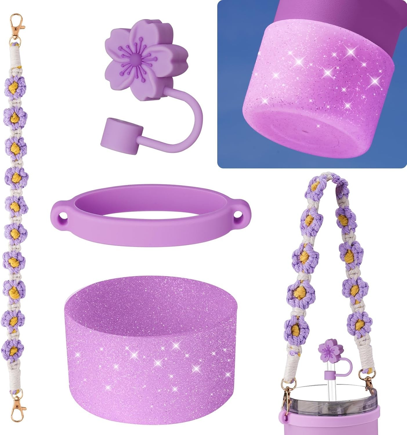 Tuelaly Water Bottle Handle Strap - Handmade Flower Sling Holder Carrier Lanyard Cup Accessories Compatible with 16-40oz Stanley-Water Bottle Purple