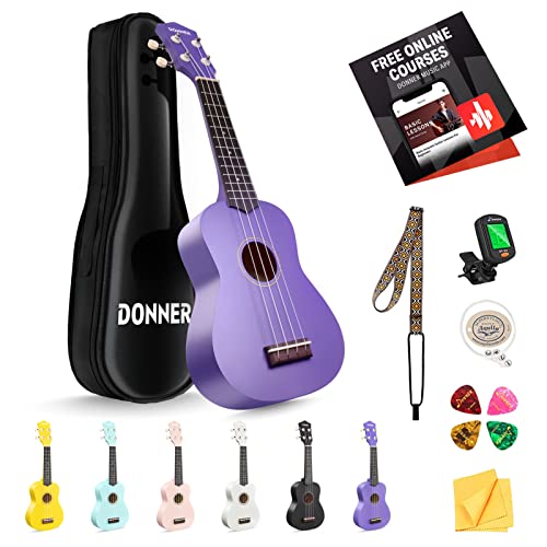 Donner Soprano Ukulele for Beginner Ukelele with Free Online Lesson Bag Strap String Tuner Pick Cloth, DMU-01 21 Inch Matte ukalalee Bundle Kit Macaron Series-Purple