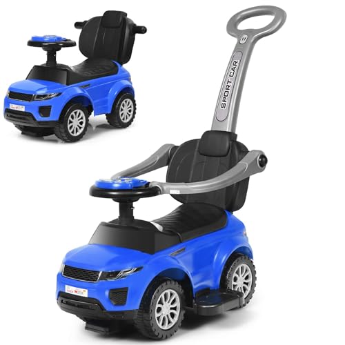 GYMAX 3 in 1 Kids Ride on Push Car, Push Along Car with Handle, Guardrails, Lights, Horn & Music, Underneath Storage, Toddler Sliding Car for 1-3 Years Old Boys Girls (Blue)