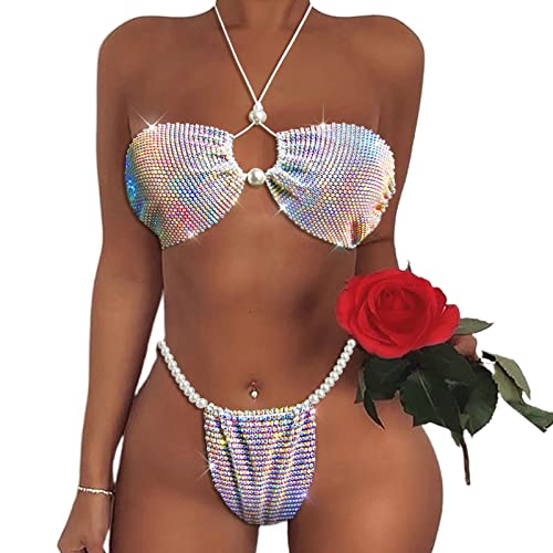 Kaeltsyn Fashion Women for Triangle Set with for Rhinestone Pearls Push Up Bandage Swimwear for Lover Girlfri ' s String Triangle Set Two Piece Push Up Bandage Swimsuit for Teens High