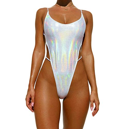 YAUASOPA Sexy Liquid Metallic Glitter One Piece Push Up Swimsuit Female Shiny Solid High Cut Beachwear, Light Silver, Medium