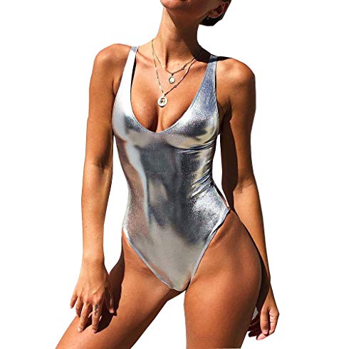 YAUASOPA Sexy Liquid Metallic Glitter One Piece Push Up Swimsuit Female Shiny Solid High Cut Beachwear, Light Silver, S
