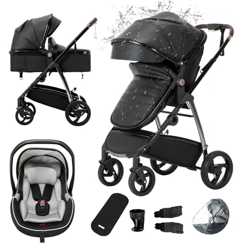 Gcarebb Leather 3 in 1 Pushchair, City Strollers with Car Seat, Portable One-Click Folding Walking Stick Stroller, Landscape Combined Strollers High Aluminium Frame for Newborn 0-4 Years