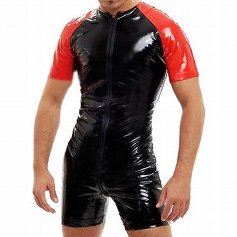 (XL) Male Exotic Sexy Faux Leather Bodysuit Front Zipper Pvc Latex Teddies Catsuit Male Gay Erotic Fetish Jumpsuits Club Wear Costume