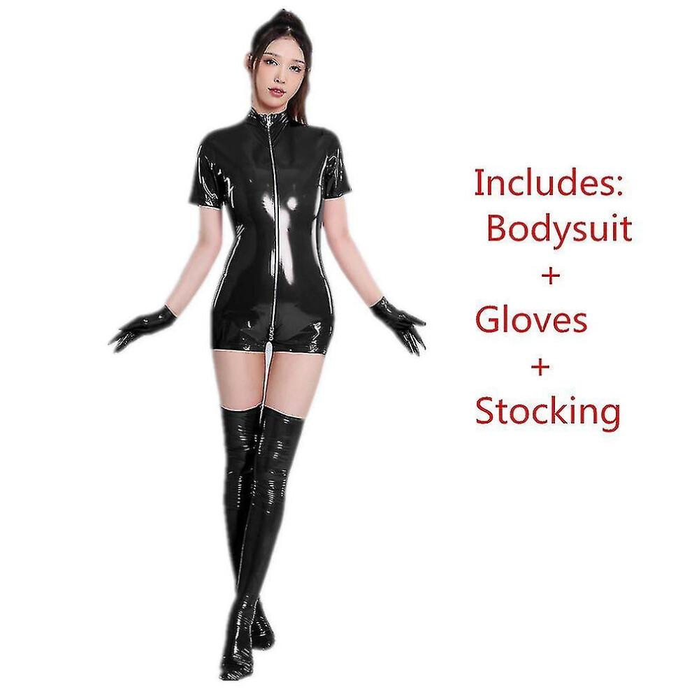 (L, Black) Sexy Wet Look Pvc Latex Catsuit Long Sleeve Front Zipper Bodysuit Pole Dance Clubwear Pu Leather Body Shirts Tops With Stocking