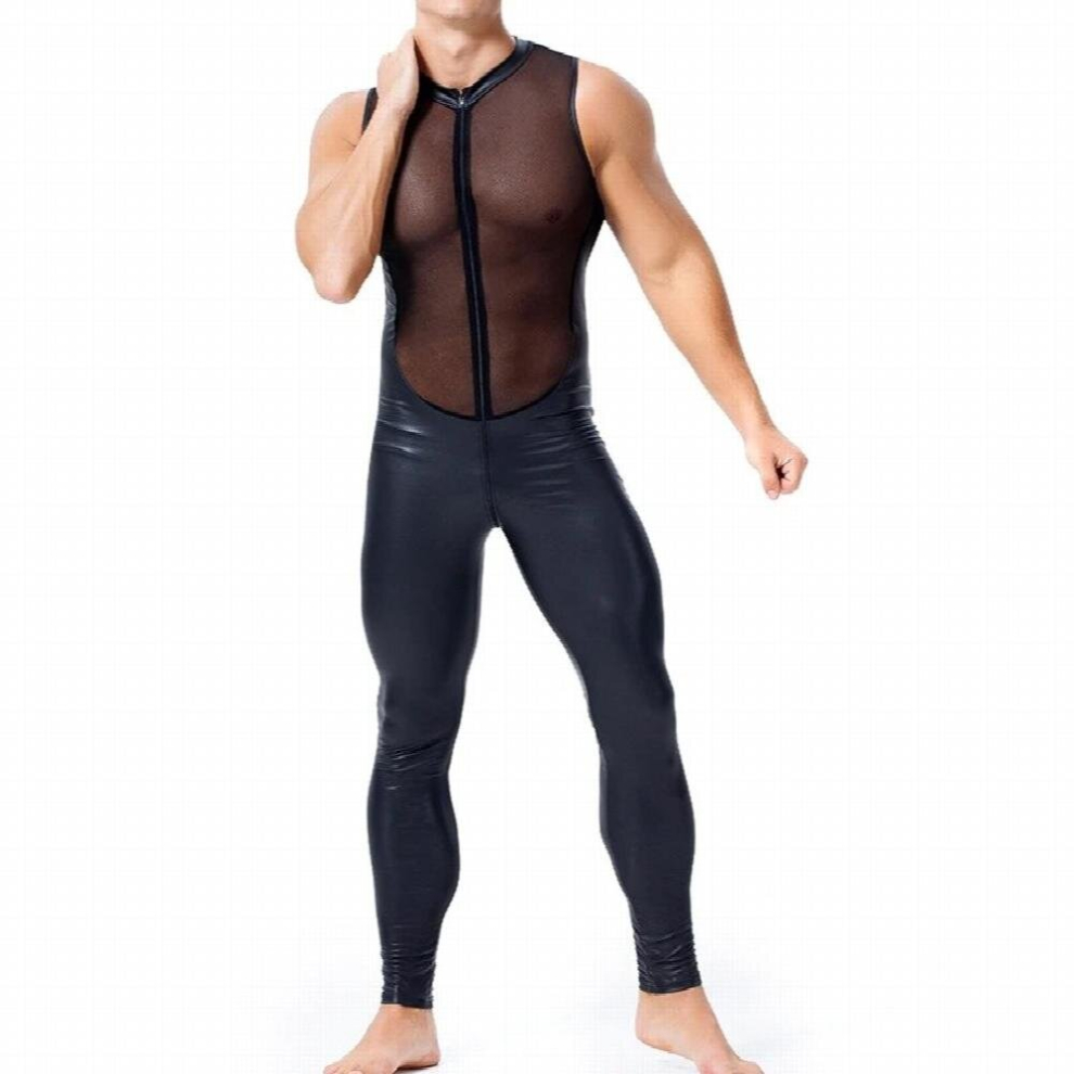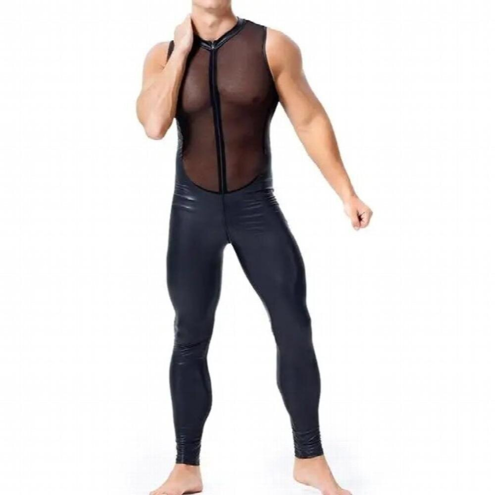 Erotic Latex bodysuit men wetlook Faux Leather Mesh lingerie Open Crotch pvc Catsuit Zipper Catsuit Fetish Wear Sexy Costume