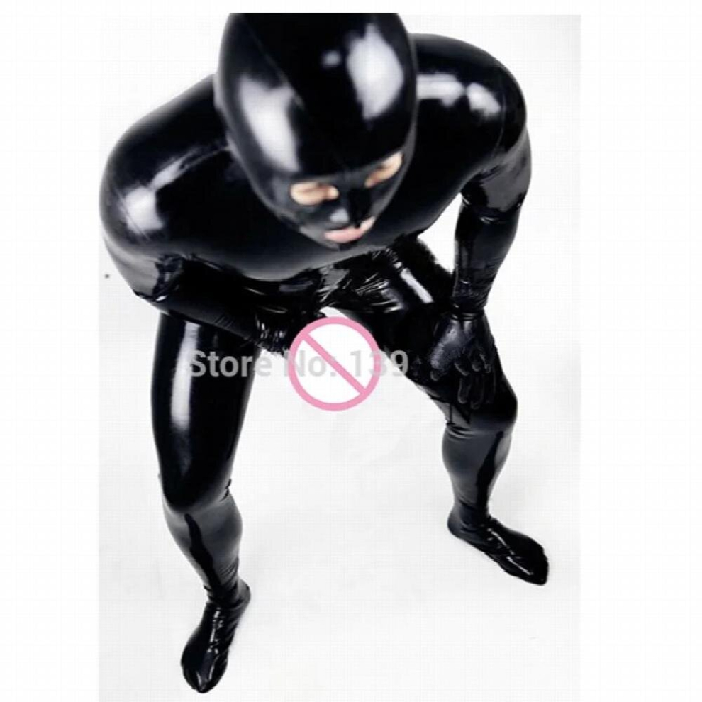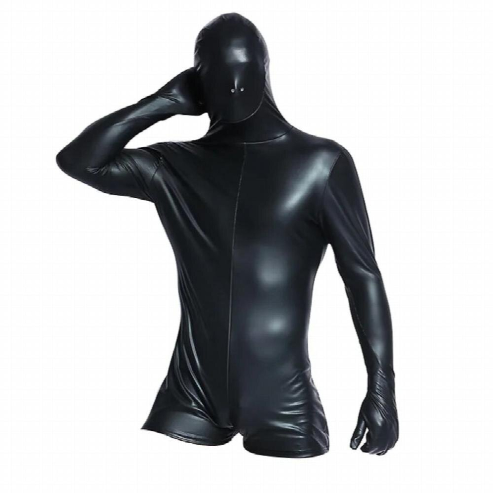 Men Sexy PVC Latex Catsuit with Mask PU Faux Leather Bodysuit Gay Erotic Fetish Zipper Jumpsuit Party Night Club Wear
