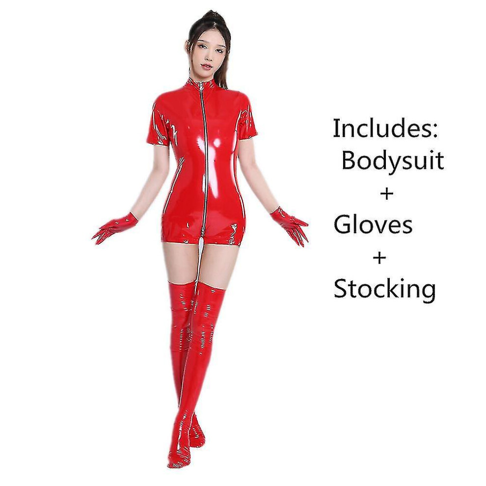 (L, Red) Sexy Wet Look Pvc Latex Catsuit Long Sleeve Front Zipper Bodysuit Pole Dance Clubwear Pu Leather Body Shirts Tops With Stocking