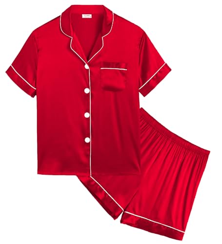 SWOMOG Girls Silk Pyjamas Short Sleeve Button-Down Sleepwear Kids 2pc Satin PJ Sets Print Pyjama Red 8-9 Years