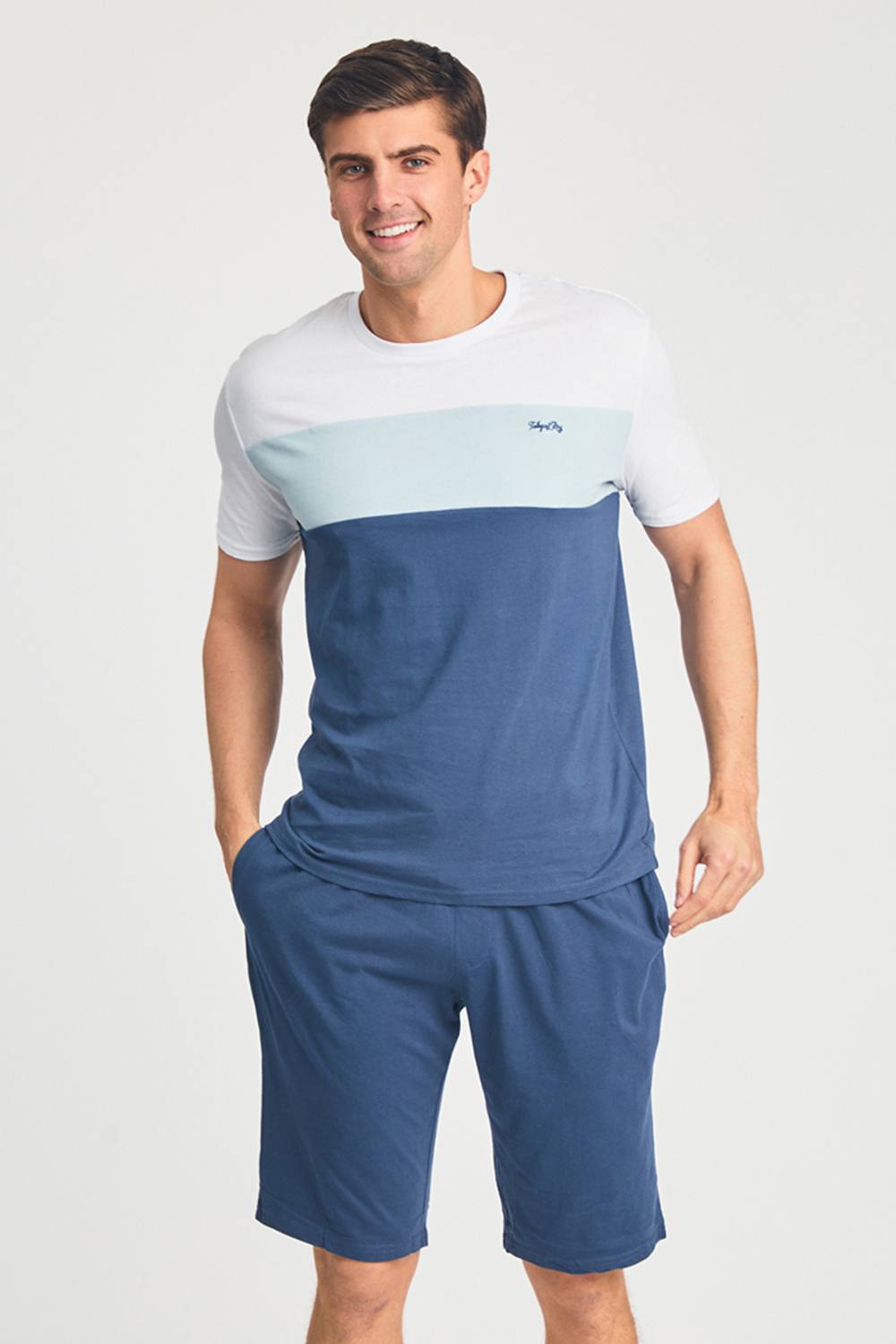 Tokyo Laundry Men Cotton 2-Piece Short Sleeve Top and Jersey Shorts Pyjama Set in Blue | Size: large