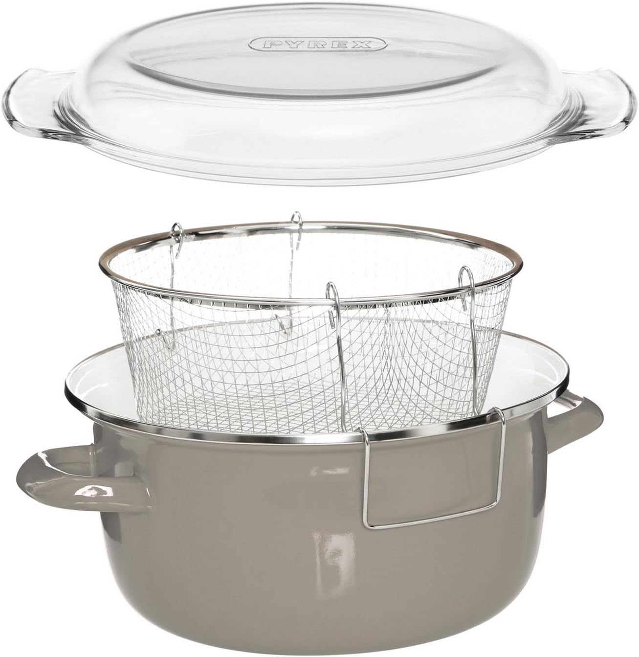 Cream Enamel Glass Pyrex Lid Steel Deep Fryer Chips Frying Fry Pan Pot Basket