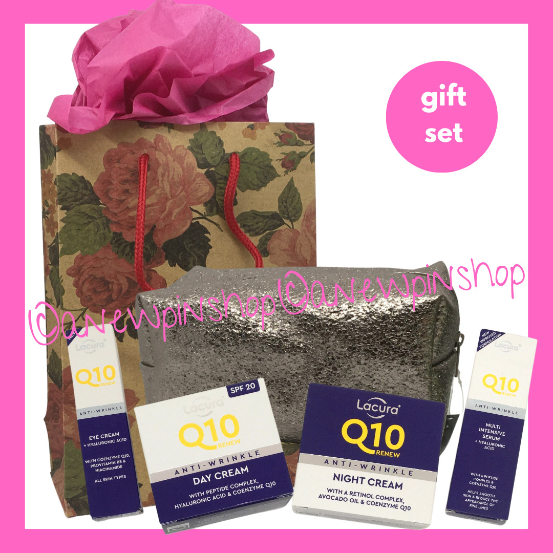 LACURA Q10 Face Cream Day Night Serum Eye Cream + Make Up Bag GIFT SET Aldi