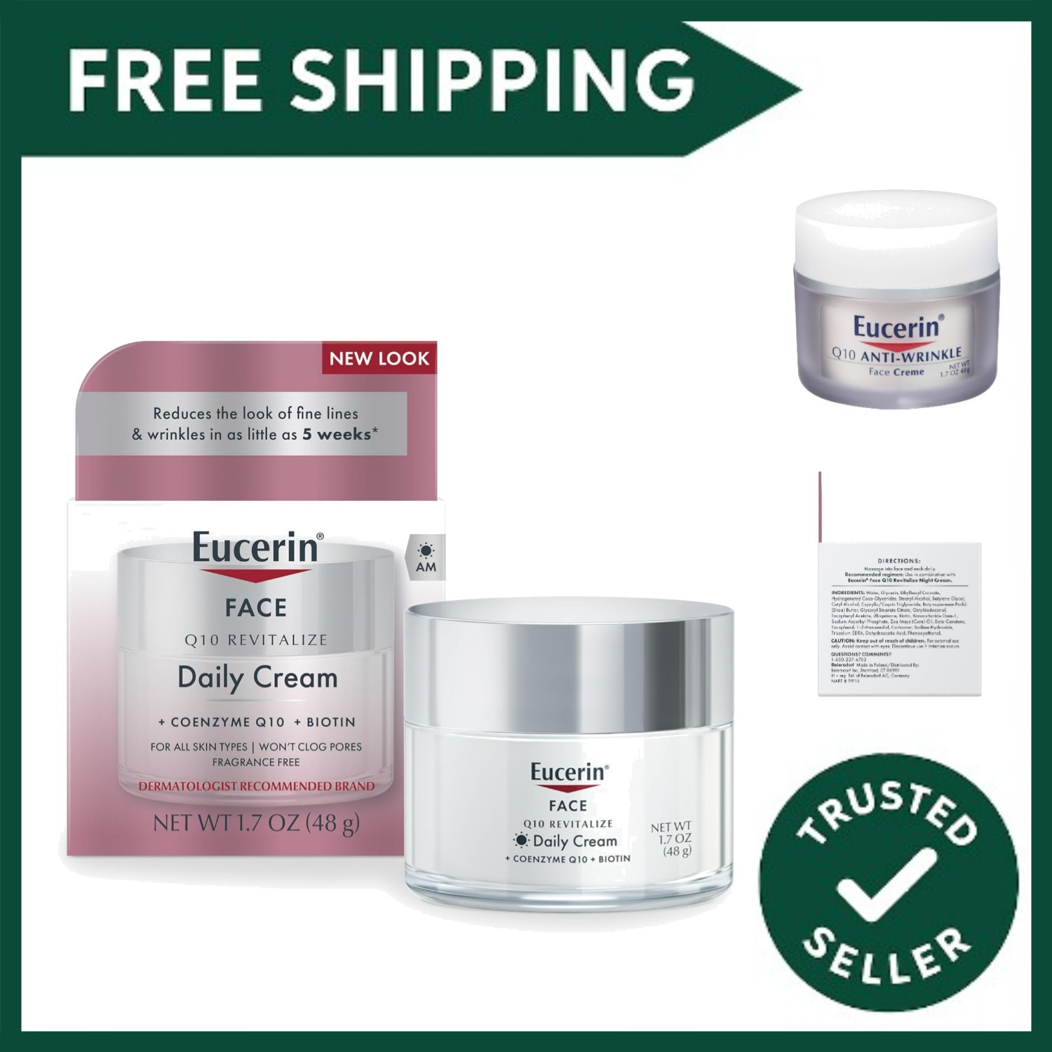 Eucerin Q10 Anti Wrinkle Skin Care Set Facial Cream for Sensitive Skin Q10 Anti Wrinkle Face Cream 1.7 Oz Jar + Q10 Anti Wrinkle Night Cream w