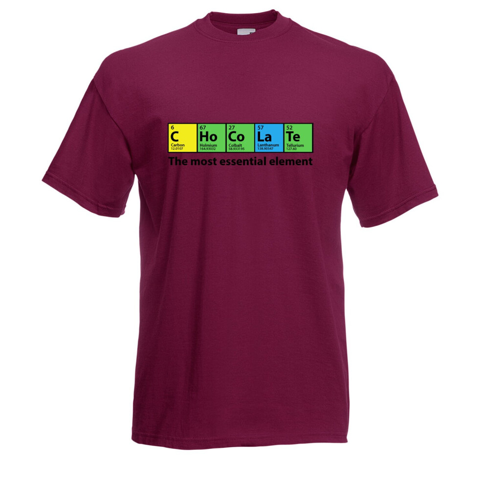 (Burgundy, S) Funny 'Chocolate - The Most Essential Element' Periodic Table Graphic Geeky, Nerdy High Quality T-Shirt, Tee, Men's, Unisex