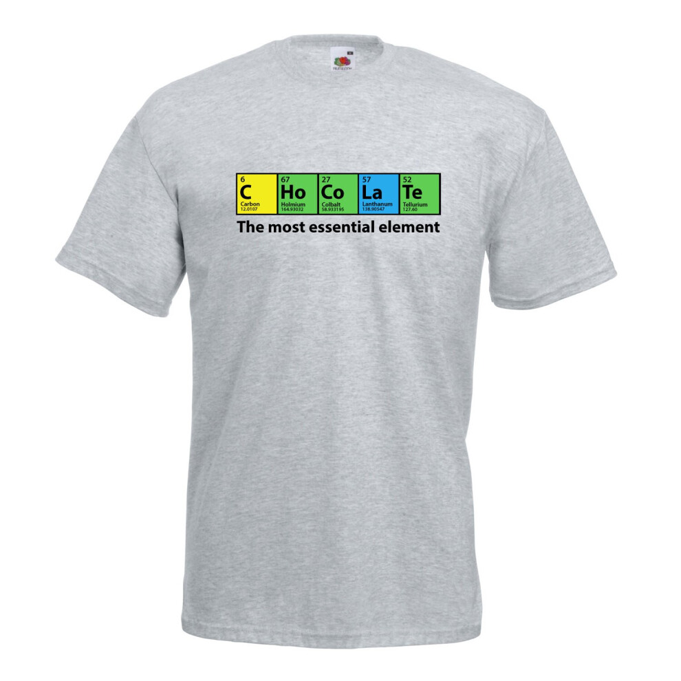 (Heather Grey, M) Funny 'Chocolate - The Most Essential Element' Periodic Table Graphic Geeky, Nerdy High Quality T-Shirt, Tee, Men's, Unisex