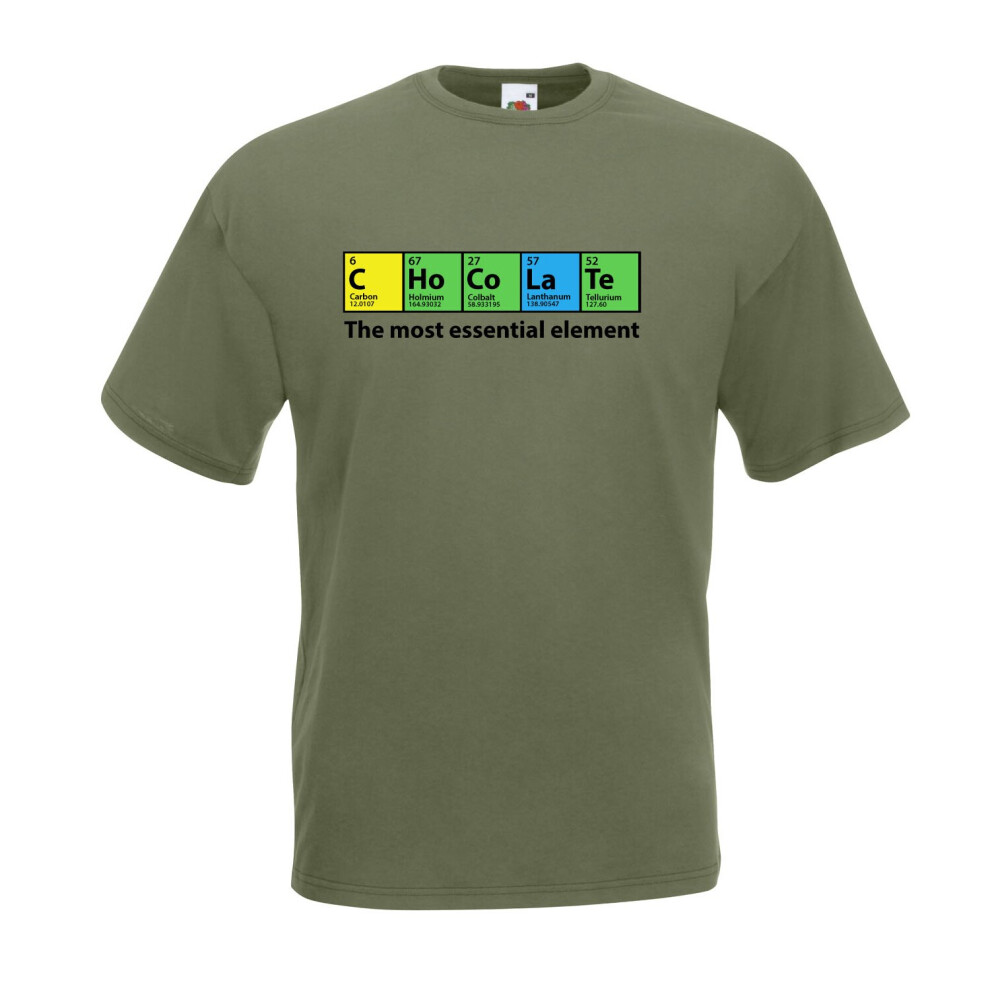 (Olive, M) Funny 'Chocolate - The Most Essential Element' Periodic Table Graphic Geeky, Nerdy High Quality T-Shirt, Tee, Men's, Unisex