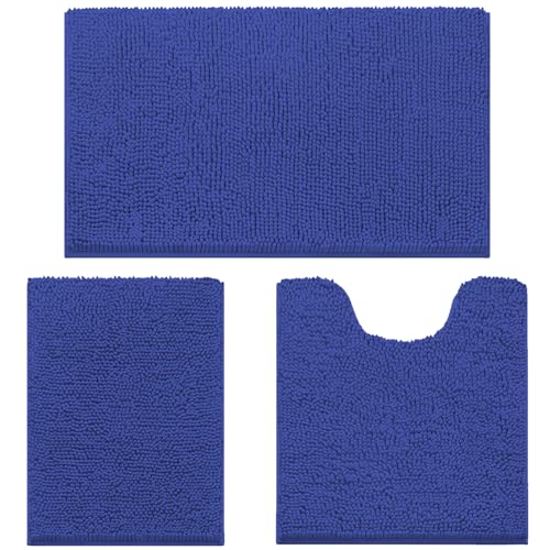 wyewye Bath Mat 3 Piece, Chenille Bathroom Mat, Extra Soft mat Non-slip,Super Absorbent Fluffy and Shaggy Bath Mats for Bathroom,Machine-Washable Quick Dry Bath Rug Foot Mat, Royal Blue