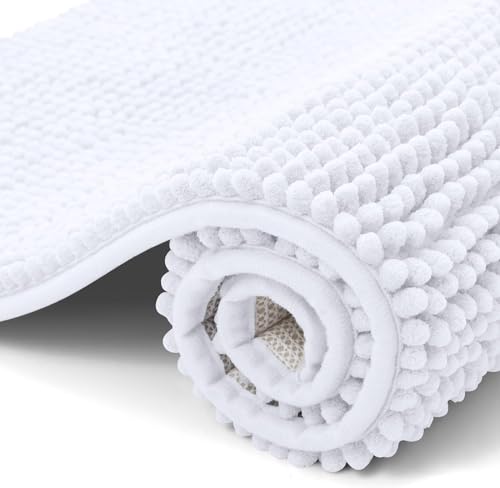 smiry Non Slip Chenille Bath Mat, Extra Soft Bathroom Mat, Super Absorbent Fluffy Bath Mats for Bathroom, Machine-Washable Quick Dry Bath Rug Foot Mat, 40 x 60 cm, White