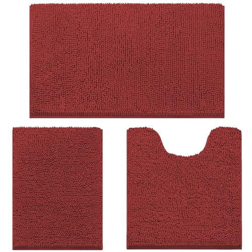 wyewye Bath Mat 3 Piece, Chenille Bathroom Mat, Extra Soft mat Non-slip,Super Absorbent Fluffy and Shaggy Bath Mats for Bathroom,Machine-Washable Quick Dry Bath Rug Foot Mat, Burgundy