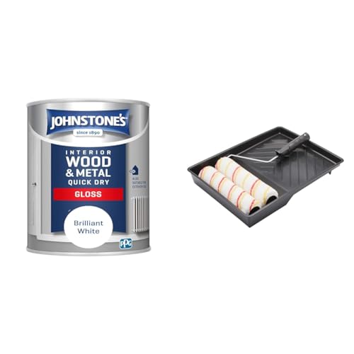 Johnstone's , Quick Dry Gloss, Brilliant White, Gloss Finish 8m2 Coverage per Litre, 0.75 L & Fit For The Job 4 piece 9 inch Twin Paint Roller Set for DIY Painting