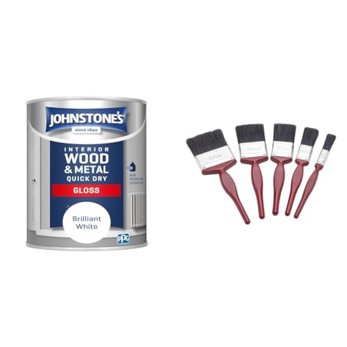 Johnstone's - Quick Dry Gloss - Brilliant White - Gloss Finish - Water Based & Fit For The Job 5 pc Mixed Sizes Paint Brush Set for a Smooth Finish with Emulsion, Gloss