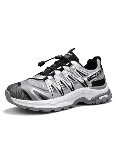 Men’s Trail Running Trainers – Breathable Mesh, Quick-Lace Toggle, Cushioned EVA Midsole & Non-Slip Rubber Outsole (Silver, Adult, Men, 7, Numeric, UK Footwear Size System, Wide)