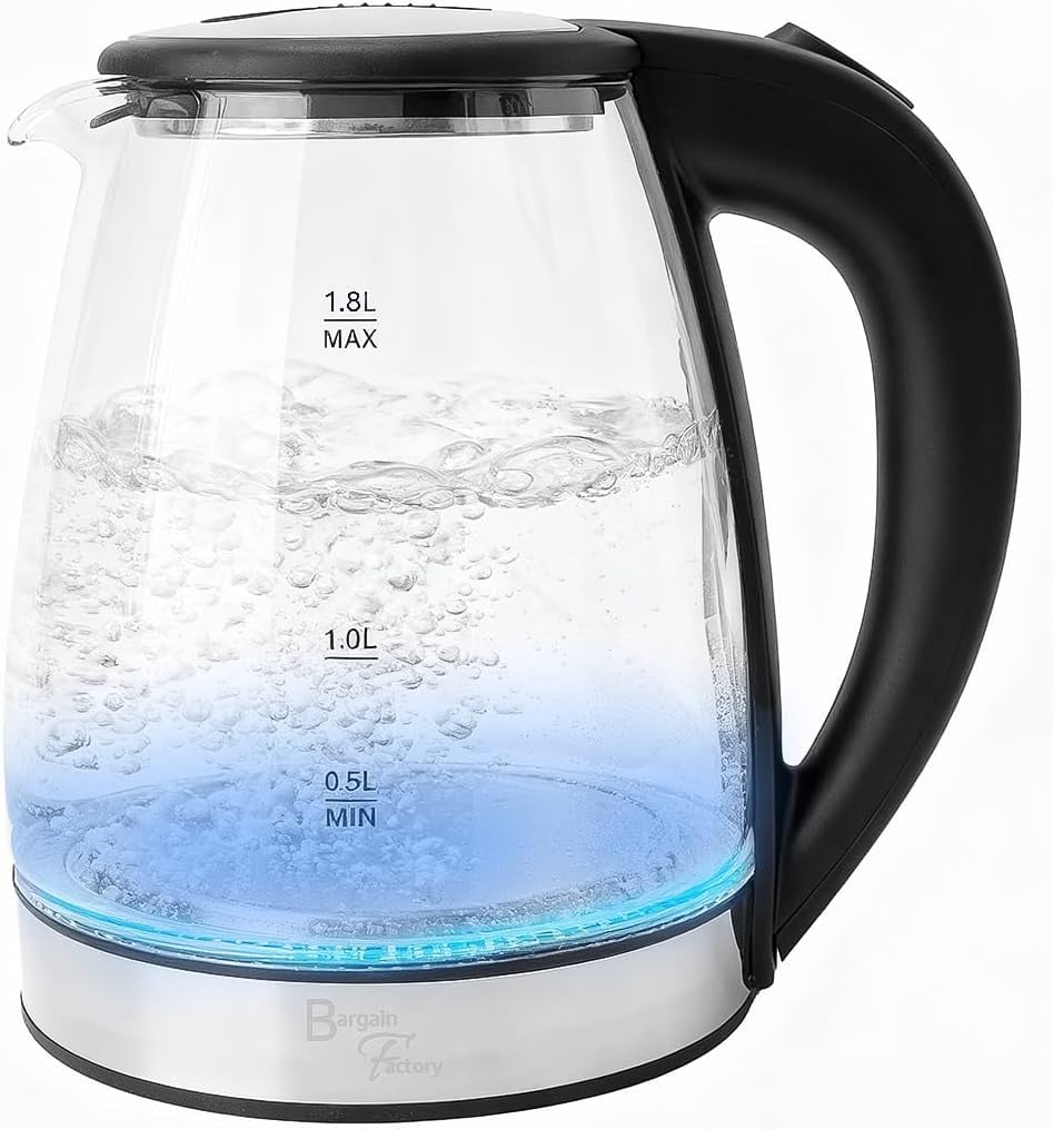 Bargain Factory Electric Kettle Glass 2L – 1800W Fast Boil, BPA-Free, Quiet Boil, Blue LED, No Plastic, Boil-Dry Protection, Black Electric Glass Kettle