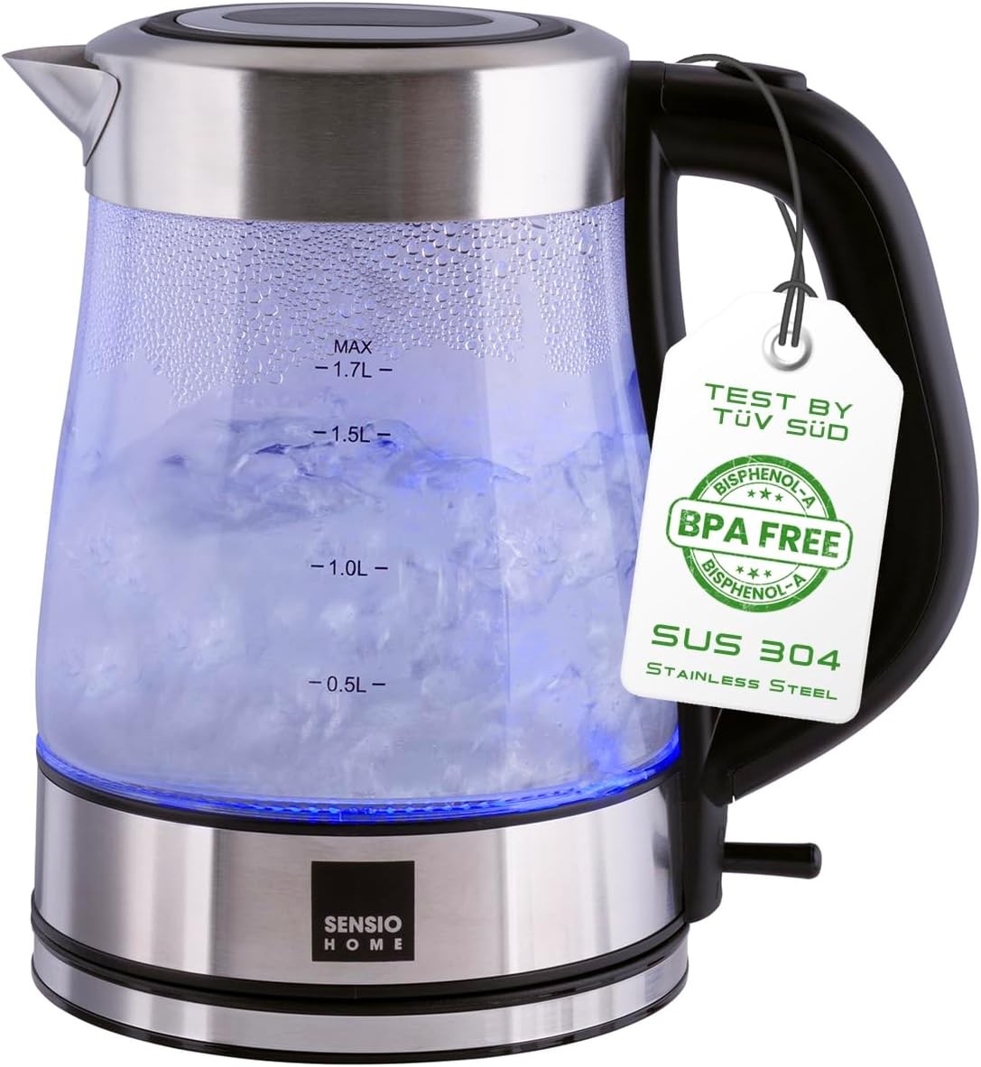 Sensio Home Electric Cordless Glass Kettle 1.7L Quiet Fast Boil, 3000W