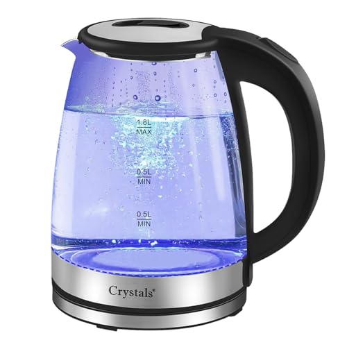 Crystals 1.8L Glass Electric Kettle | 1500W Fast Boil Cordless Kettle with Blue LED | Quiet Boil, Low Wattage Travel Kettle | Auto Shut-Off, Boil-Dry Protection, Easy Clean for Home & Office