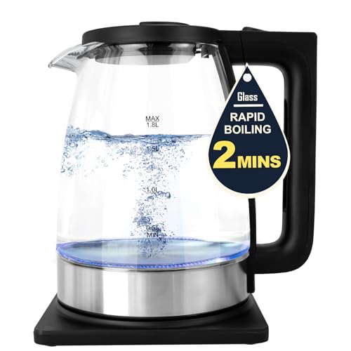 ZHODADA Glass Electric Kettle, 1500 Watt 1.8L Multi-Use Water Kettle with Blue LED, Heat- Resistant Glass, BPA- Free,Stainless Steel Base & Overheating Protection,Fast and Quiet Boil,UK Plug Black