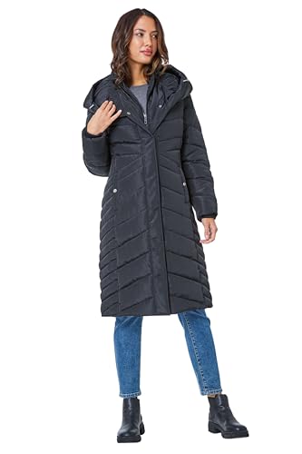 Roman Originals Padded Coat for Women UK - Ladies Longline Puffer Winter Quilted Parka Waterproof Rainproof Wind Resistant Thermal Jacket Long Length Warm Zip Hood Puffa Cosy - Onyx - Size 12
