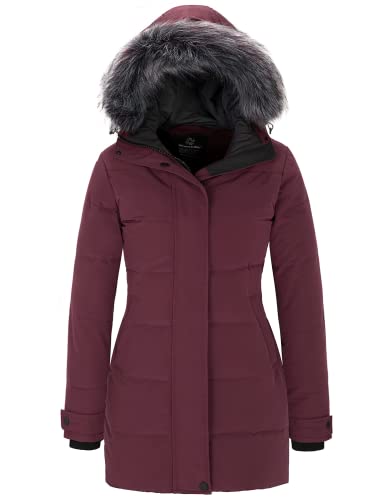 Wantdo Women’s Outdoor Winter Fleeced Lined Puffer Coat Long Warm Thicken Parka Coat Classic Ladies Water Resistant Padded Jacket Hooded Windproof Quilted Jacket Wine Red M