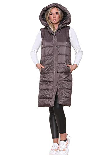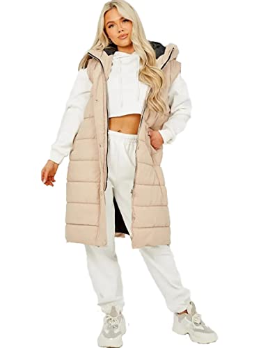 H&F Women's Ladies Long Quilted Gilet Jacket Longline Sleeveless Thick Hooded Side Zip Down Lightweight Ladies Long Coat Bodywarmer Outdoor Gilet Padded Waistcoat Size S-3XL (Beige, M)