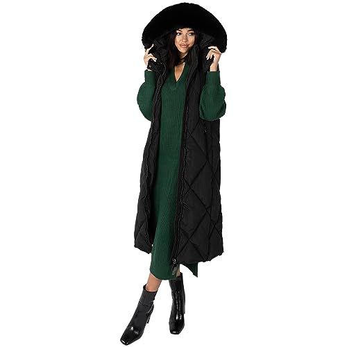 Lovedrobe Women's Long Gilet Ladies Winter Jacket Faux Fur Hooded Quilted Body Warmer Padded Sleeveless Coat Outerwear, Black, 28