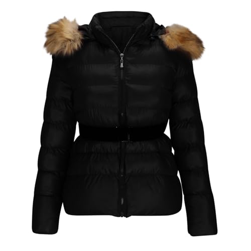 Zeiayuas Women's Hooded Winter Coat Waterproof Warm Long Puffer Jacket Parka Jacket with Belted Ladies Faux Fur Trim Hooded Jacket Puffer Quilted Long Sleeve Knee Length Outerwear UK