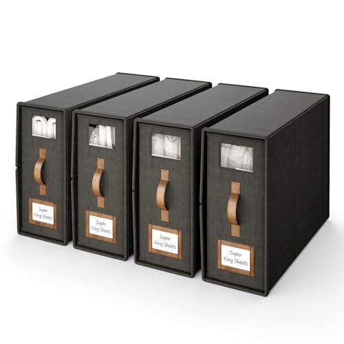 BigPonPon 4 Pack Bed Sheet Organizers And Storage,Foldable Sheet Organizer For Linen Closet(Super King Size),Linen Bedding Storage Box With Leather Handle For Bedsheets,Flannel Blankets,Thin Quilts