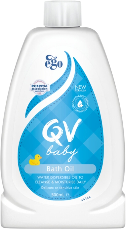 QV Baby Bath Oil, 500ml - with Vitamin E, Delicate, Water-dispersible, Everyday Use, Non-Greasy for Sensitive Skin, Suitable for Face, Body & Hair, Baby Bath Wash for Eczema, Cradle Cap, Dermatitis