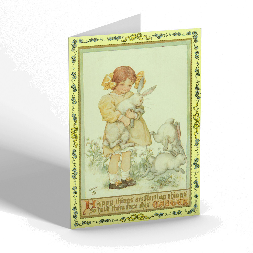 EASTER CARD - Vintage Design - Girl Carries Large Rabbit, Two Others Run Away