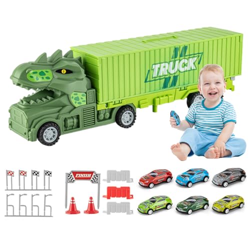 Doloowee 2 in 1 Dinosaur Car Toys for 3 4 5 Year Old Boys, Portable Transport Truck with 12 Mini Race Cars, Dinosaur Race Track Toys for Kids 3 4 5 6 7 8+ Years Old