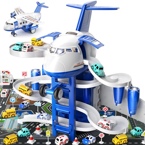 TEMI Kids Aeroplane Toys Race Track Car Toys for 3 4 5 6 7 Boys - Transformed Plane Garage Adventure Toy with 8 City Cars for Toddler Age 3-6, Parking Lot Playmat, Kids Gift