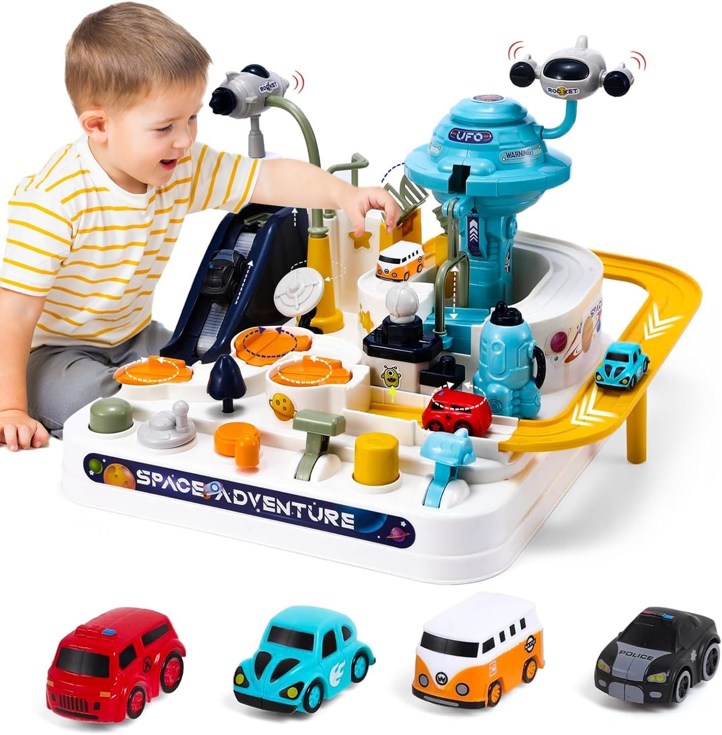 TODARRUN Kids Race Track Toys for Boy Car Adventure Toy for 3 4 5 6 7 8 Years Old Boys Girls,Space City Rescue Playsets Toys 4 Mini Cars, Preschool Educational Car Games Gift Toy