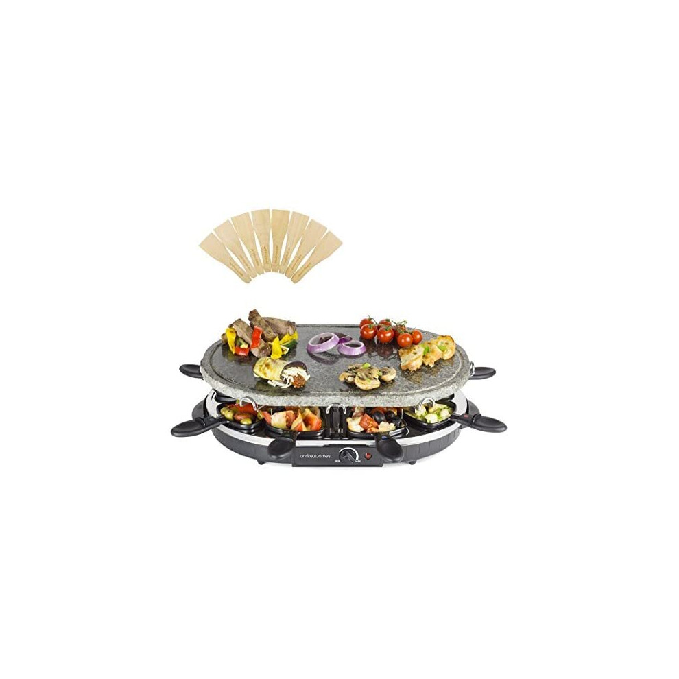 Andrew James Electric Raclette Hotplate Party Grill Machine | Oval Stone Hot Plate | 8 Fondue Cheese Pans and Wooden Spatulas Set | Great for Indoor T
