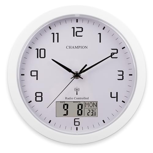 Champion 25cm MSF Radio Controlled Quartz wall clock with inset LCD display with day/date - White