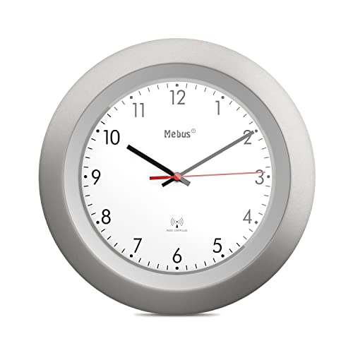 Mebus Radio Controlled Wall Clock, Classic Model, Silver Frame, White Dial, 29 cm Diameter, Round, Radio Controlled Clock (DCF77), Model: 19448, Colour: Silver, White