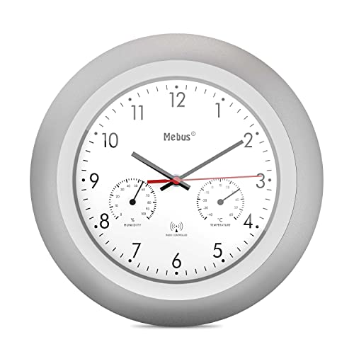 Mebus Radio-Controlled Wall Clock with Thermometer and Hygrometer/Silver Frame/White Dial/29 cm Diameter/Round/Model: 19450/Colour: Silver, White