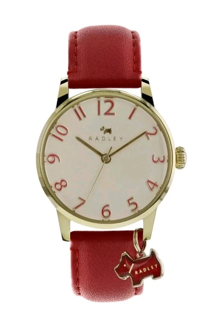 NEW LADIES RADLEY WATCH SATIN CHAMPAGNE DIAL RED LEATHER STRAP & RADLEY CHARM