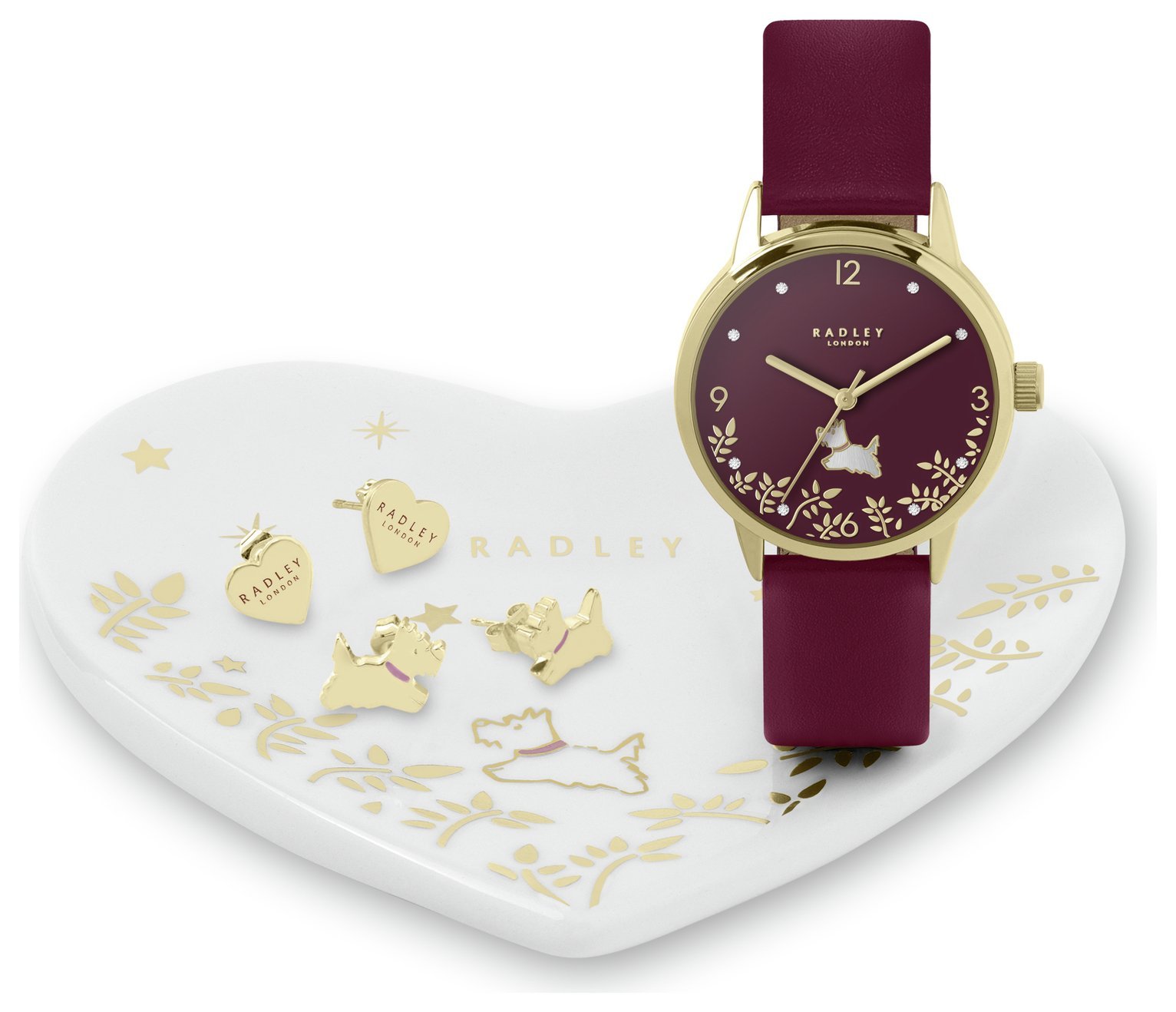 Radley Cranberry Leather Watch, Earring & Trinket Tray Set