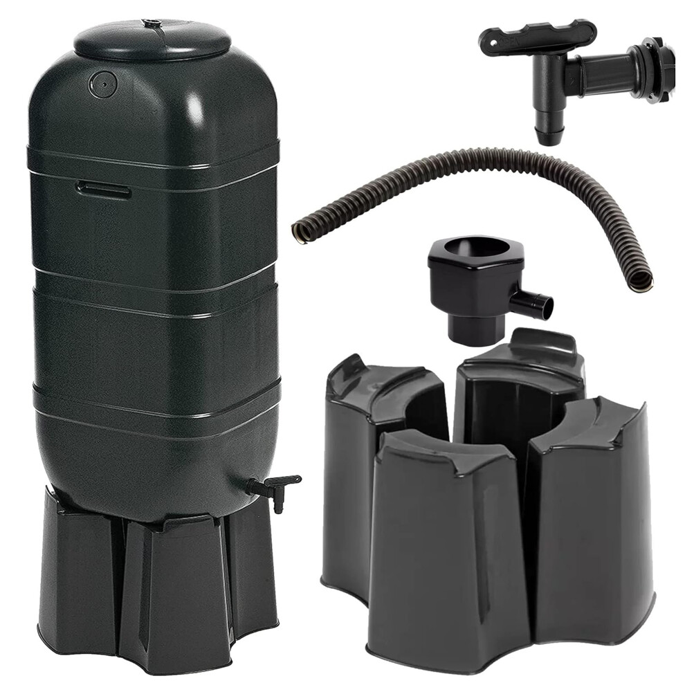 100L Black Water Butt Kit with Stand, Lid & Diverter for Slimline Rain Barrel for Garden
