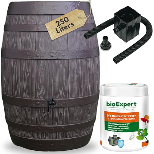 Rustic Oak Barrel Appearance Water Butt Kit With Tap, Diverter And Bio Cleaner - 250L Plastic Rain Water Collector for Garden - H36.61 x D25.6 in (93x65cm) With Faux wood texture in Brown