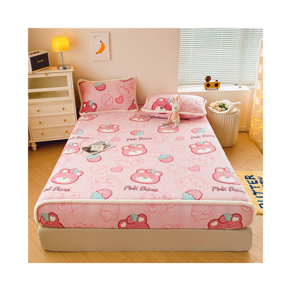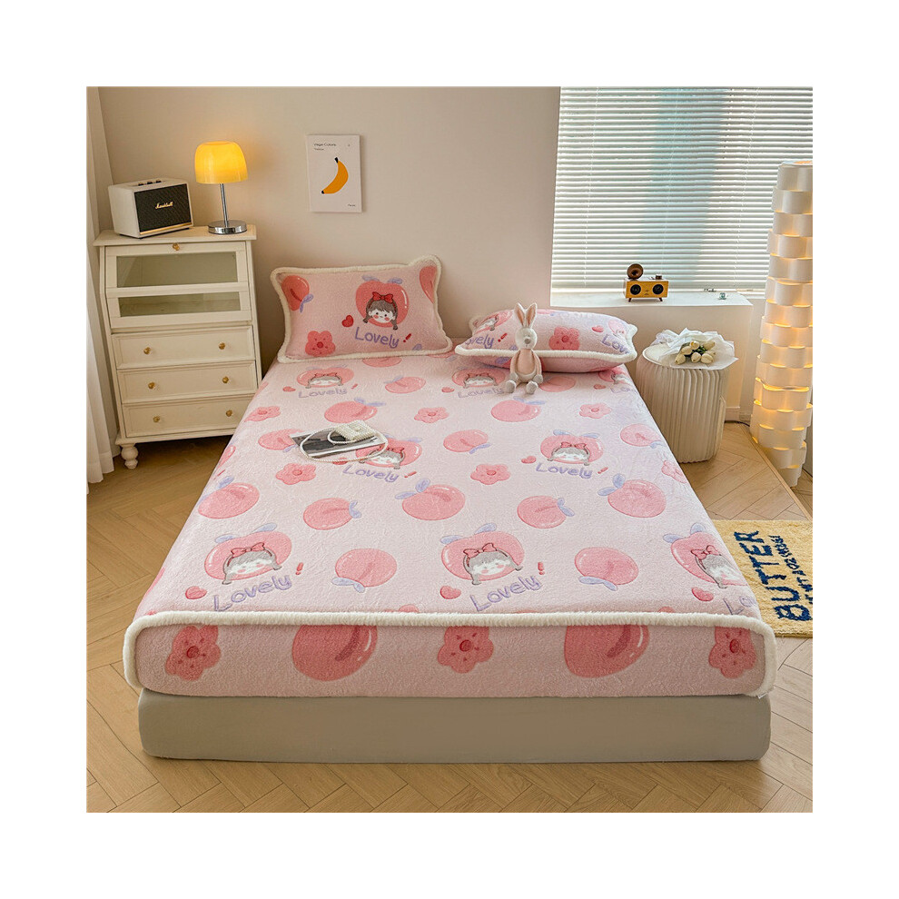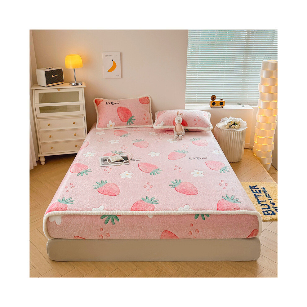 (Peach, 180x200cm) Lotso Rainbow Strawberry Pattern Plush Bedspread Pillowcase Cover Set Protective